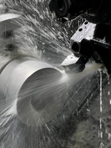 飛行機のエンジンに使われている「ブレード」の生産を行う工場での、専用機械を使用した部品の切断作業・面取り作業